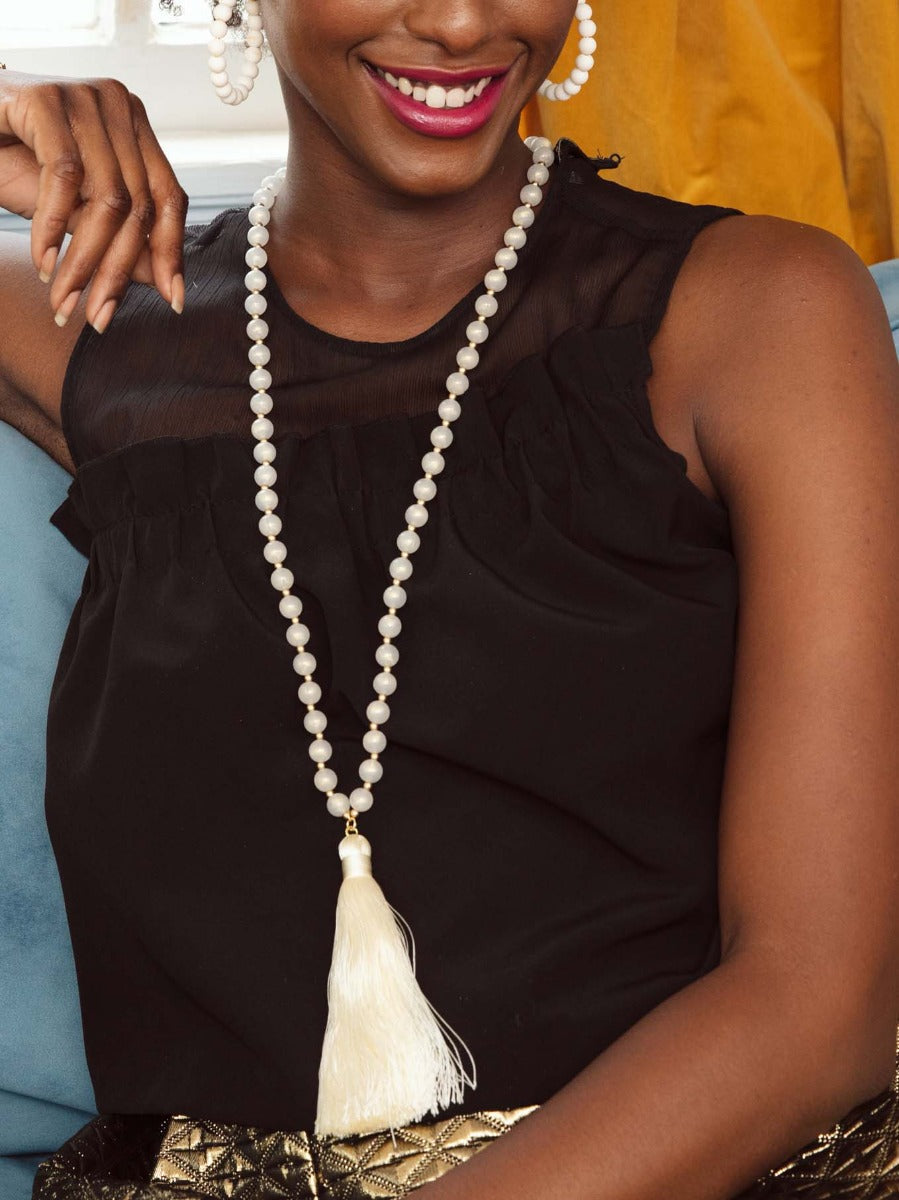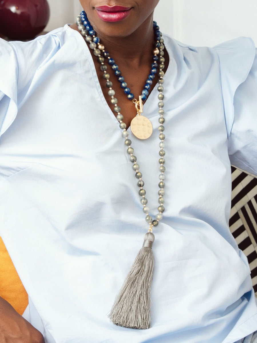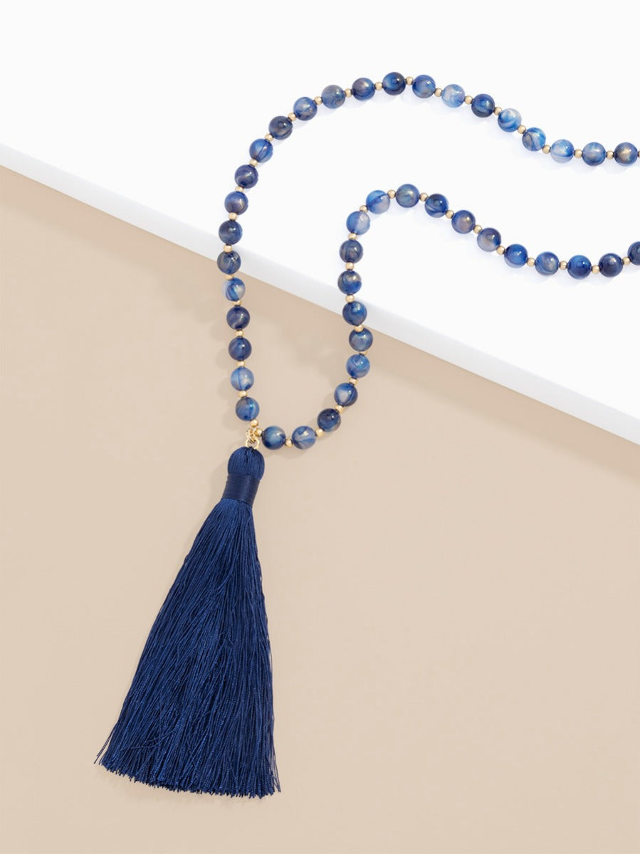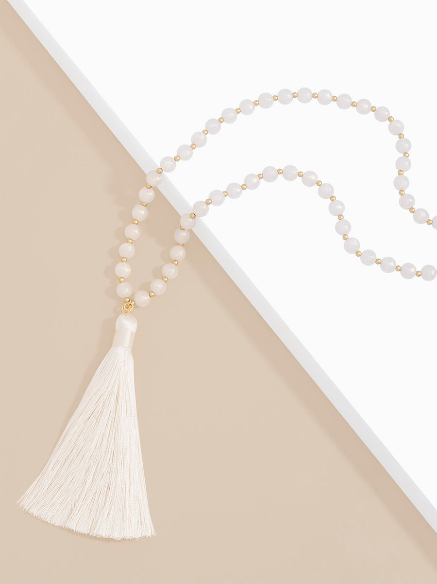 Long necklace composed of iridescent beads accented with a fabric tassel.
