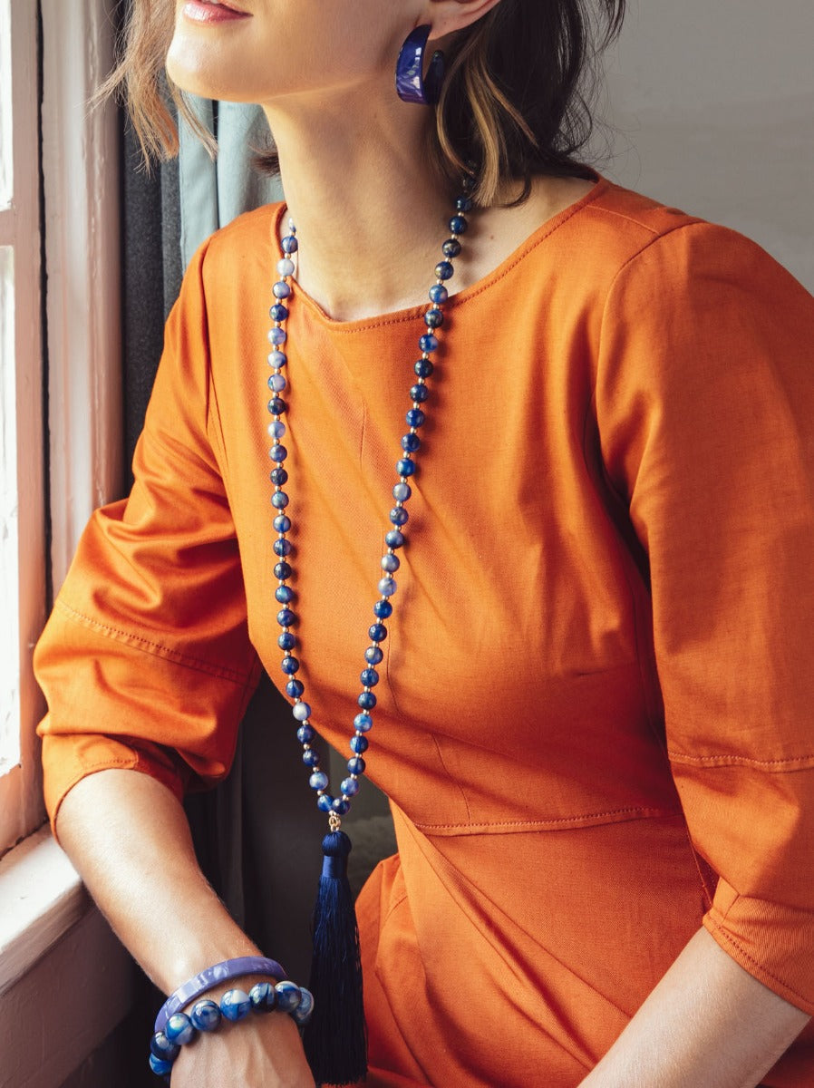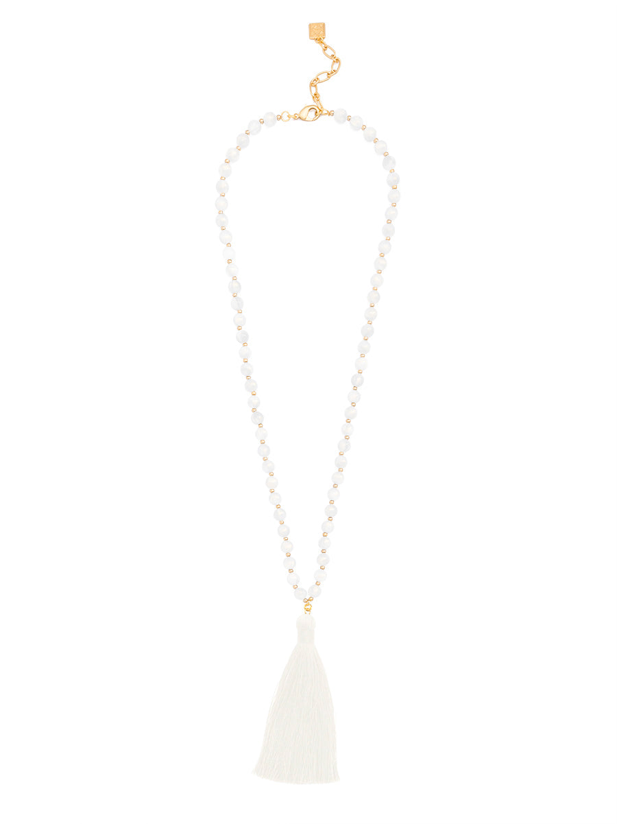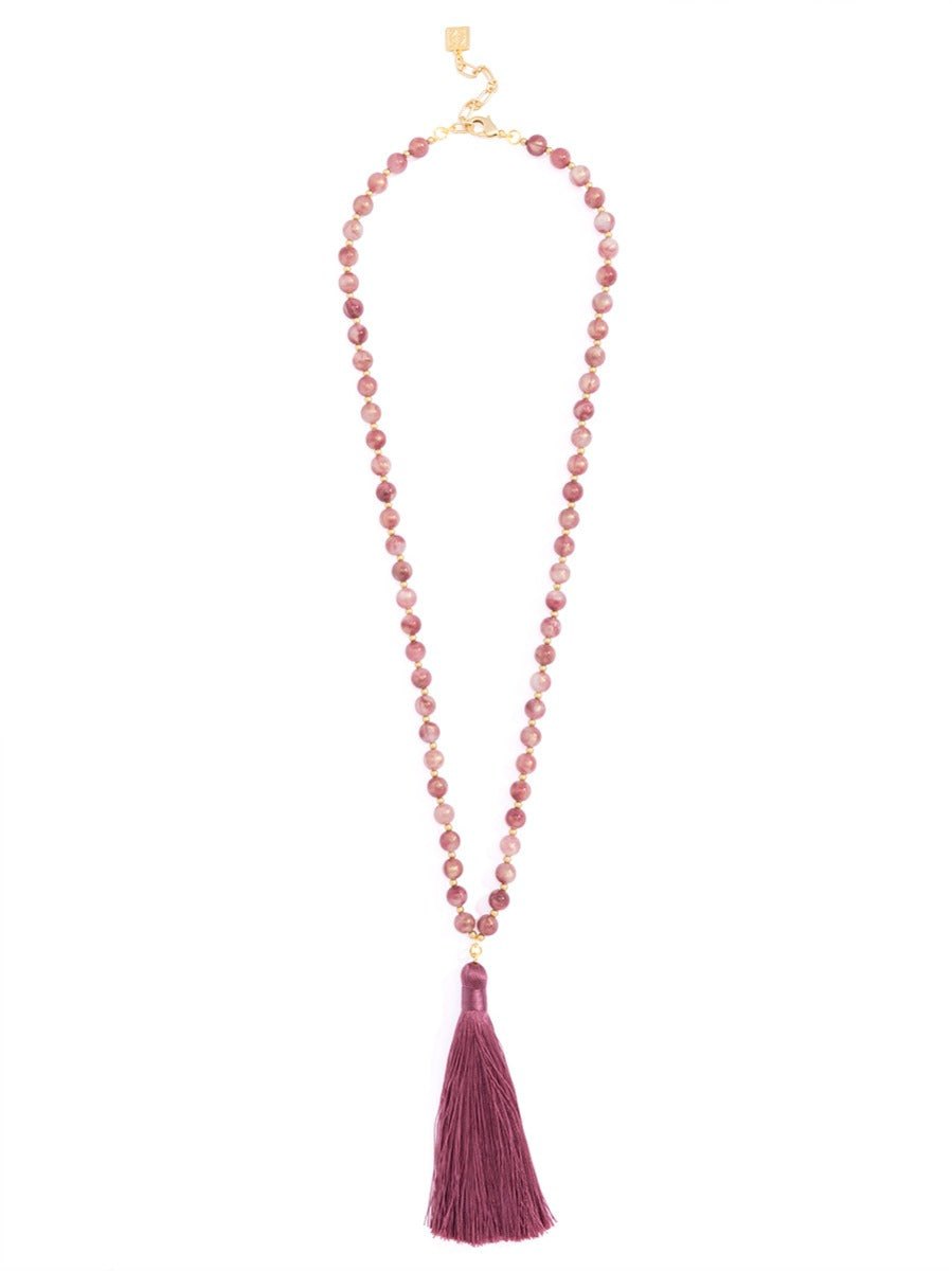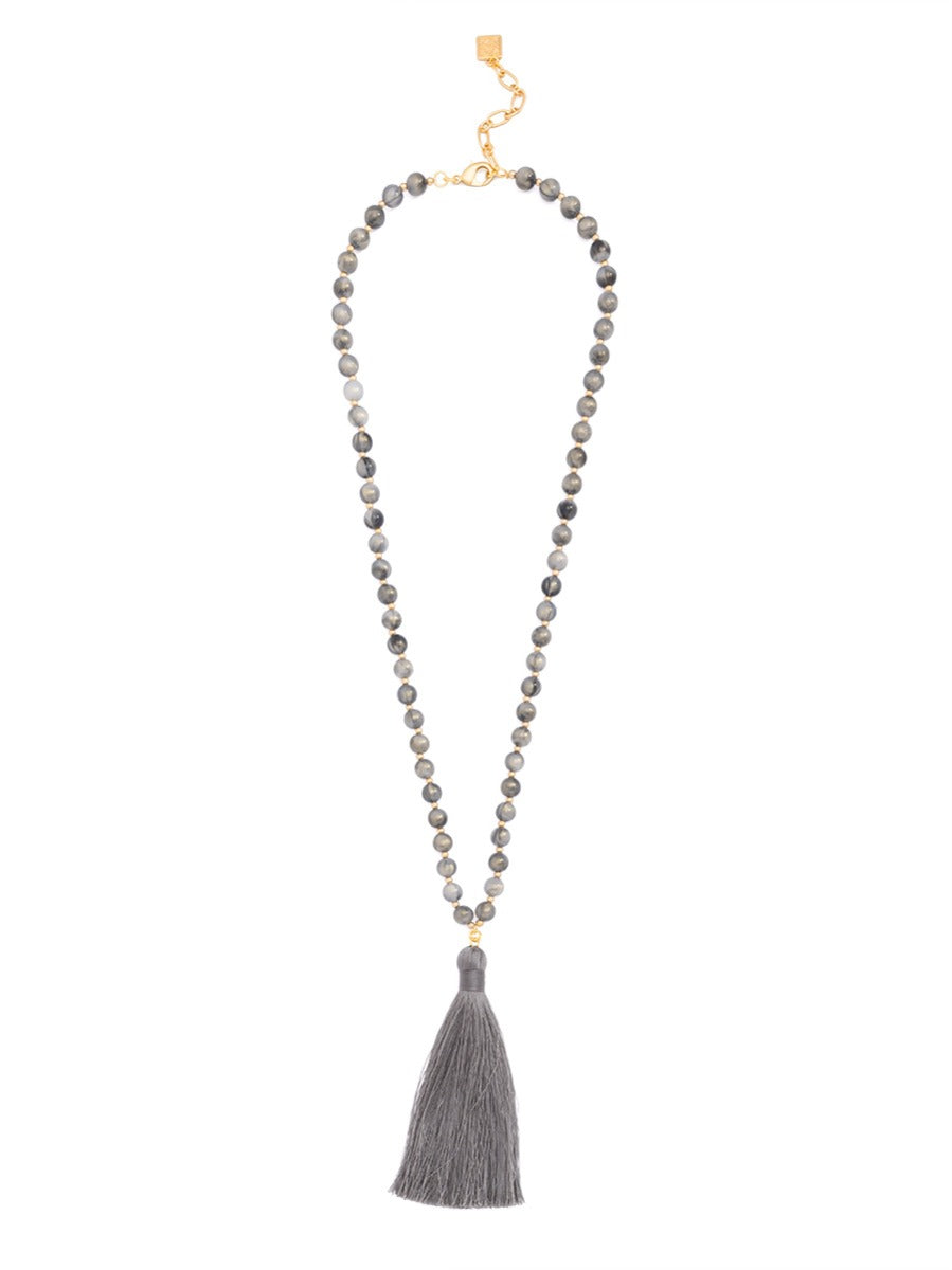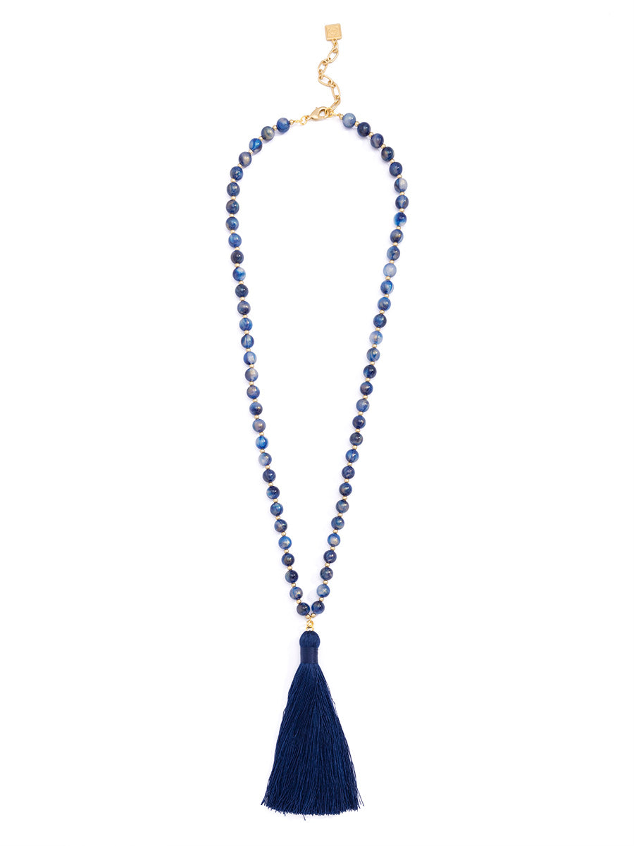 Long necklace composed of iridescent beads accented with a fabric tassel.