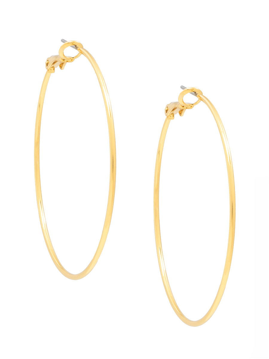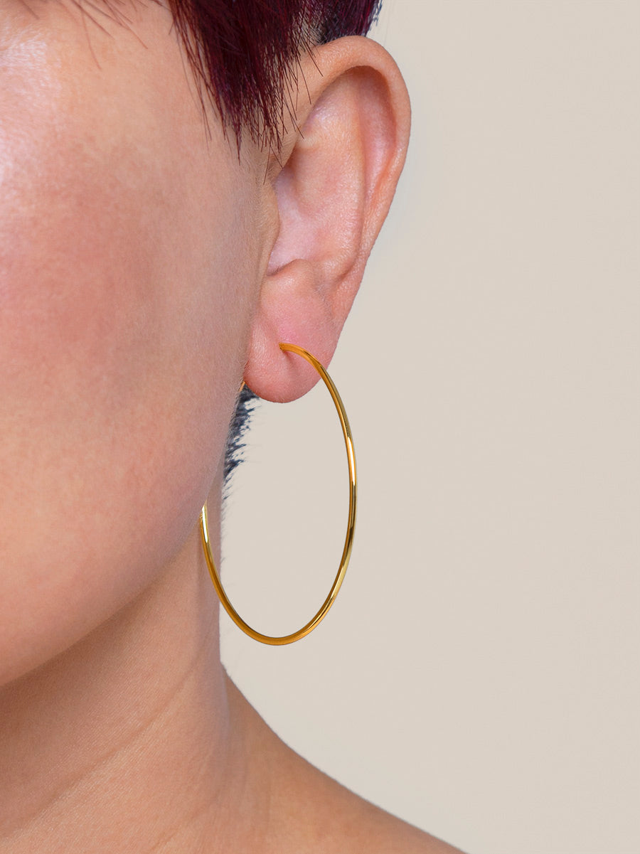 Large size slim hoop earring plated in 18K gold with a hinge closure.