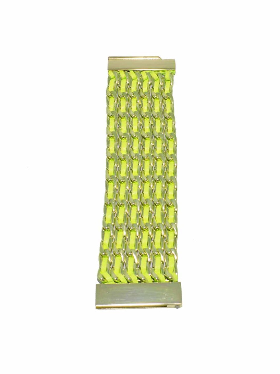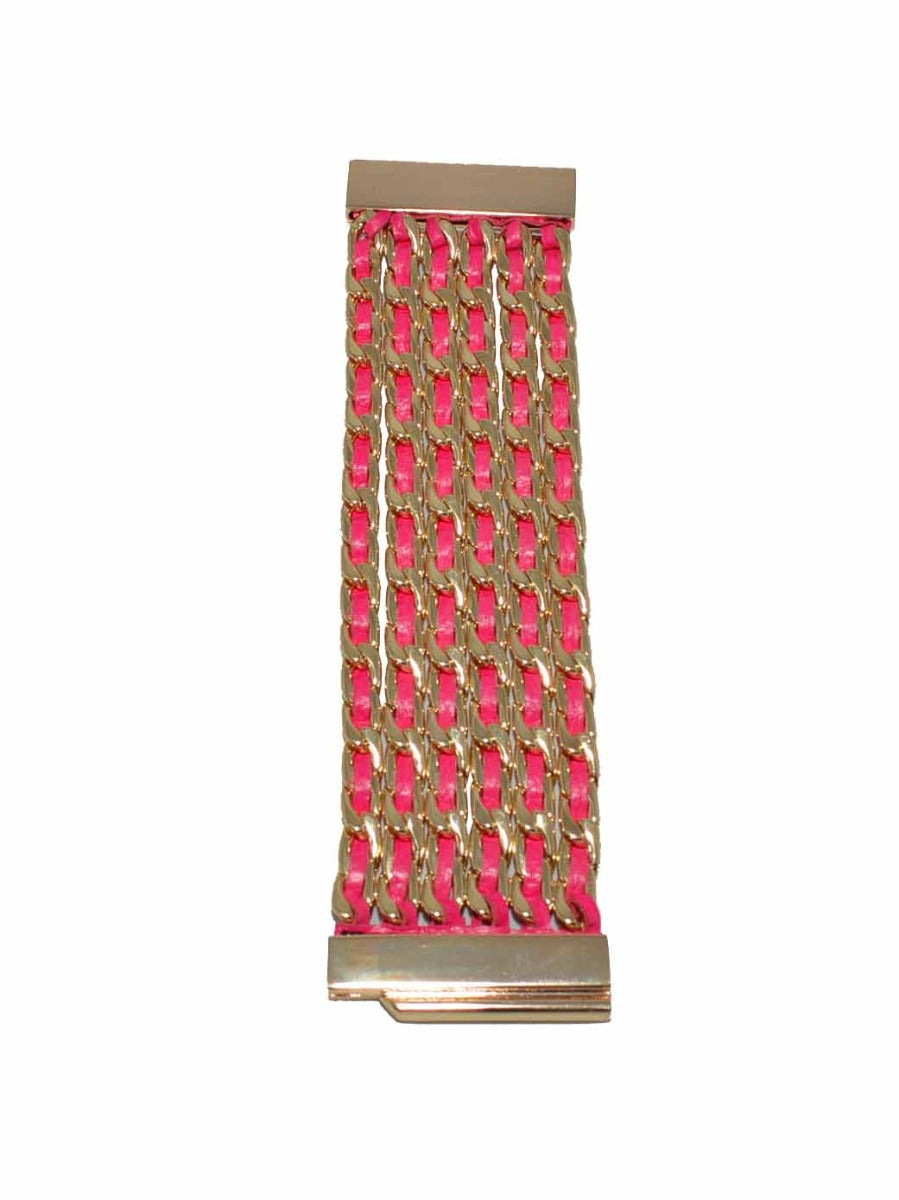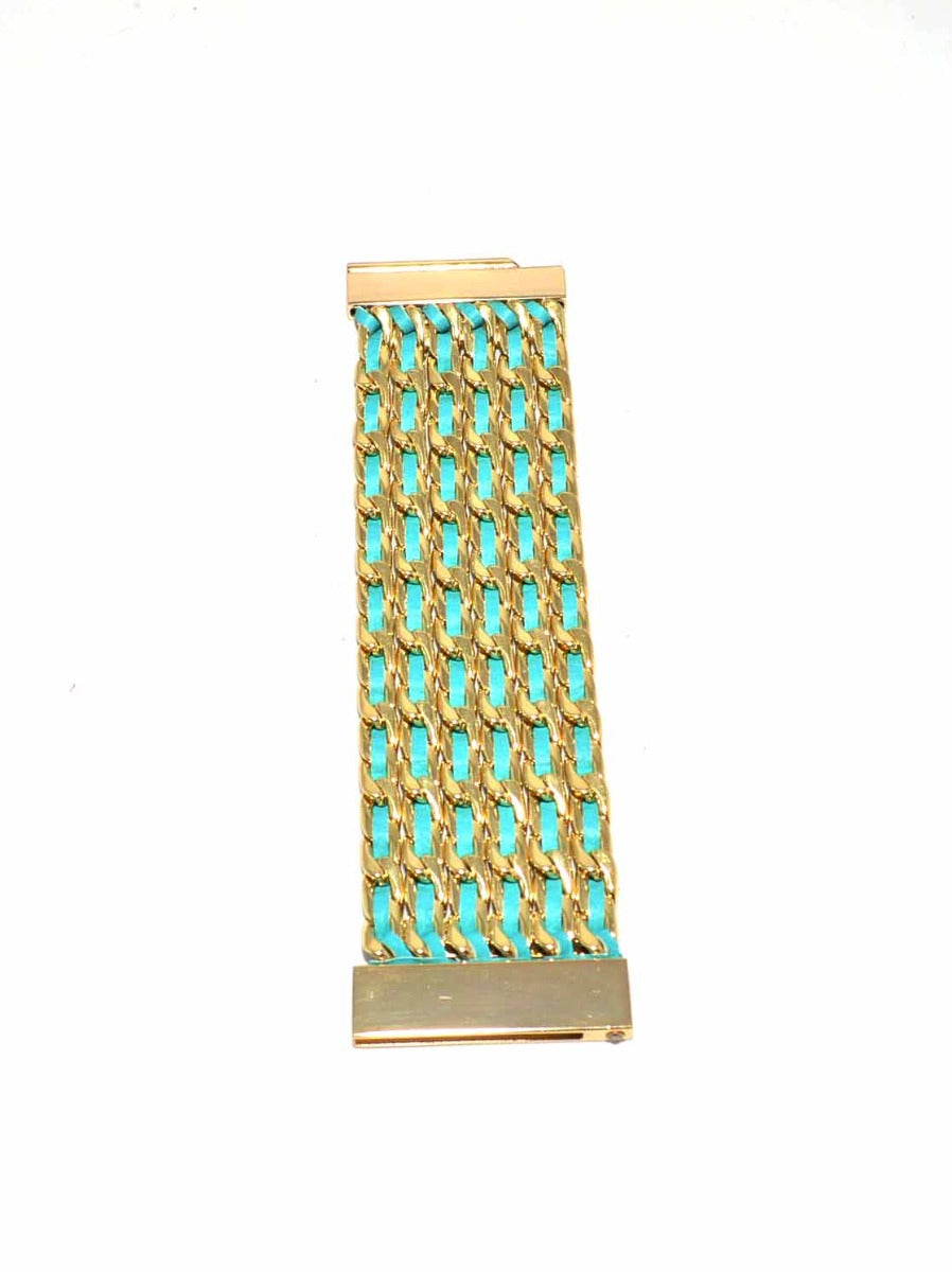 Multiple layers of leather woven through gold metal links.