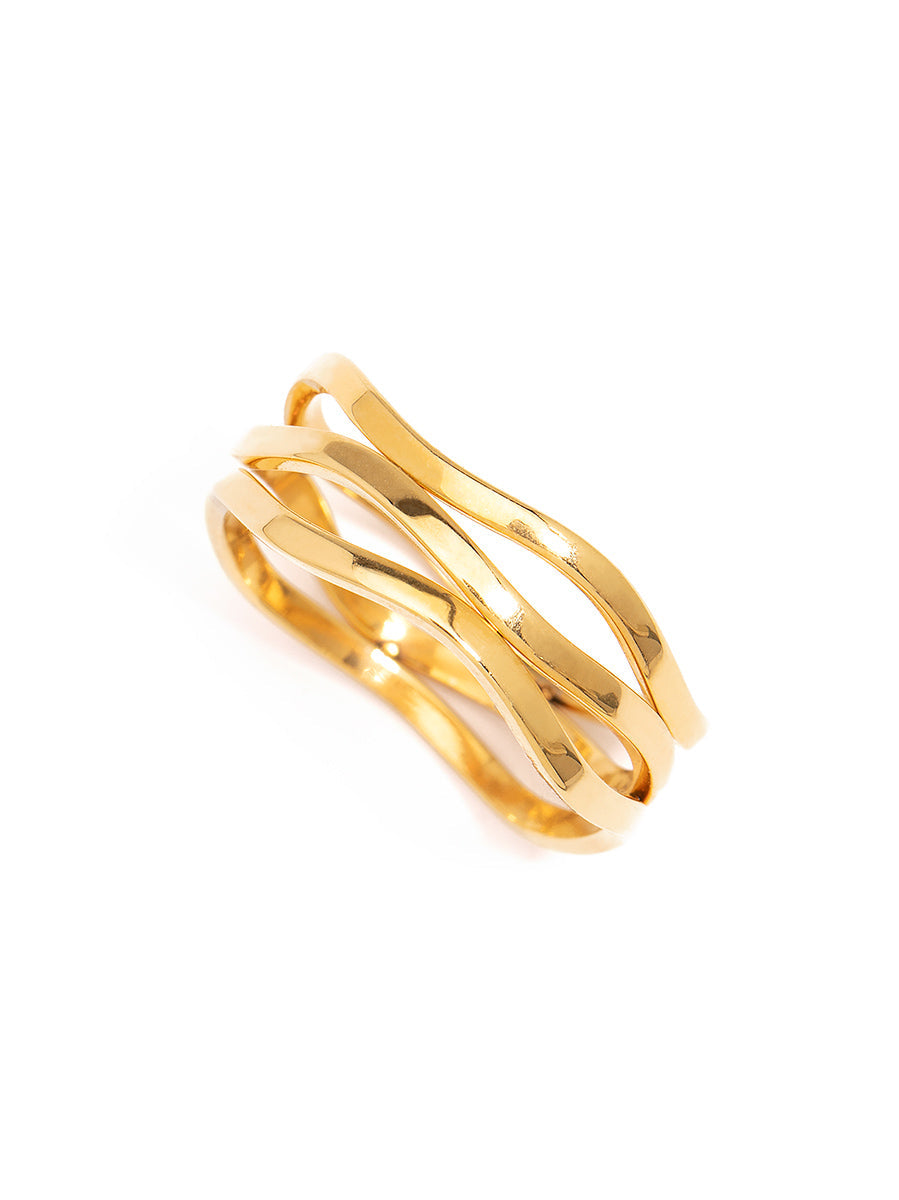 Curved, shiny metal ring with cut-outs to give the illusion of a layered look.